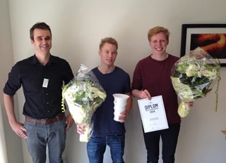 Anders Vestergaard Jensen overrækker prisen til Mathias og Anders